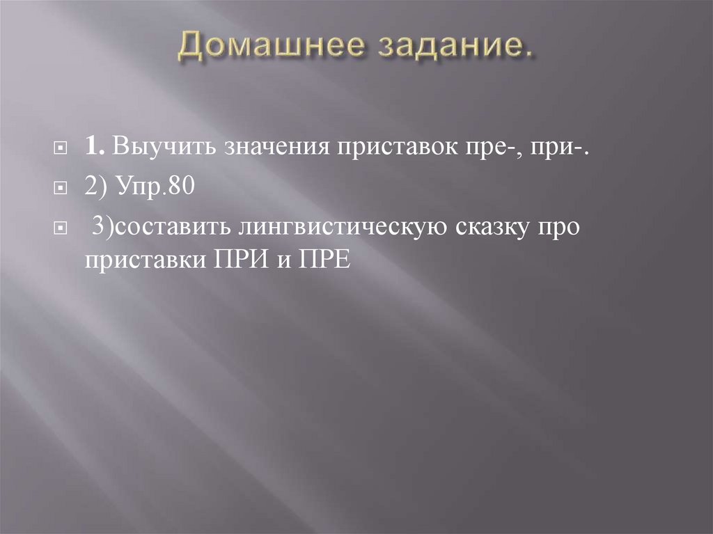 1. Выучить значения приставок пре-, при-.2) Упр.80