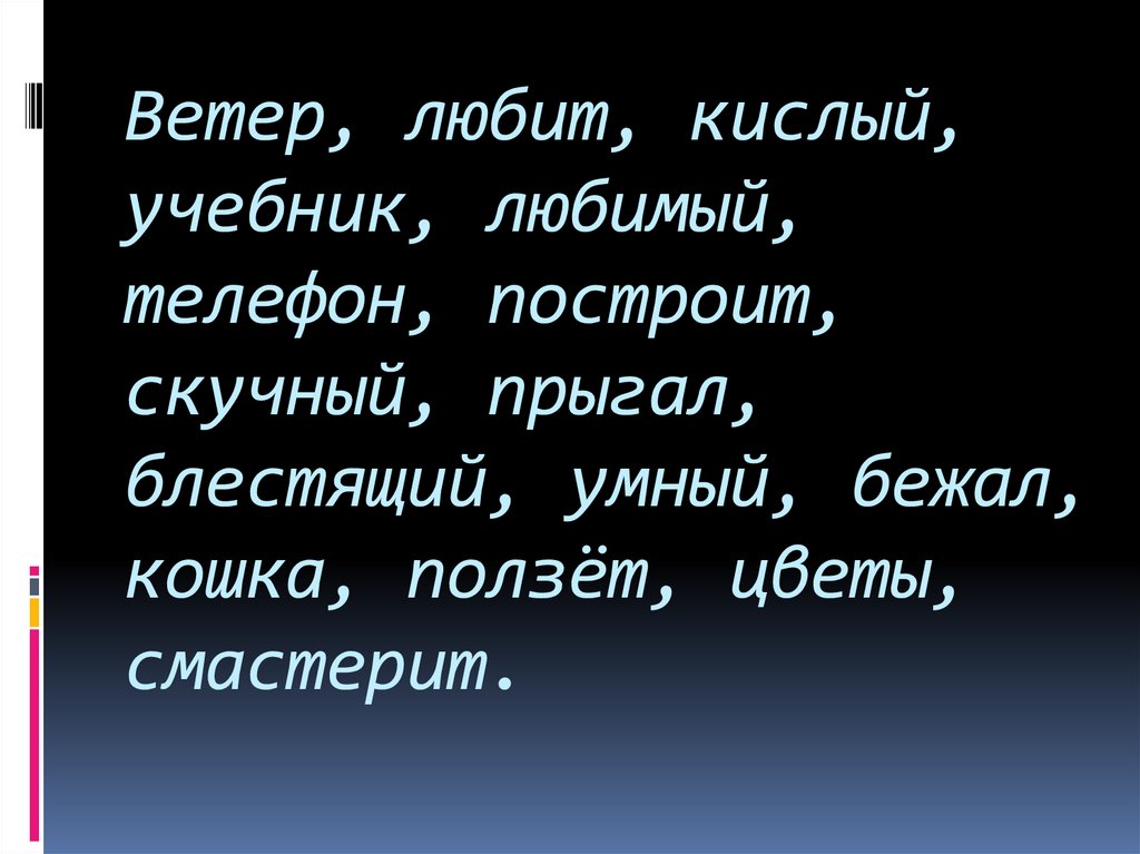 1. Ветер, любит, кислый, учебник, любимый, телефон, построит, скучный, прыгал, блестящий, умный, бежал, кошка, ползёт, цветы,
