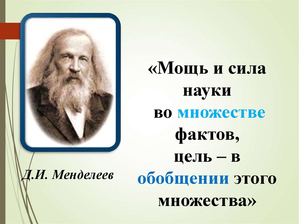 Д.И. Менделеев «Мощь и сила науки во множестве фактов, цель – в обобщении этого множества»