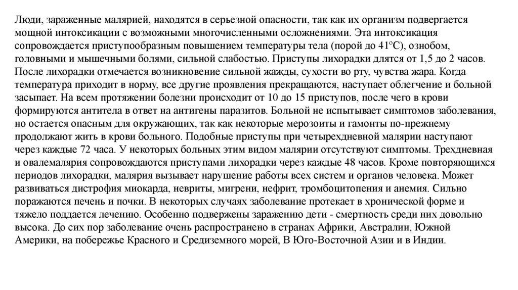 Люди, зараженные малярией, находятся в серьезной опасности, так как их организм подвергаетсямощной интоксикации с возможными многочисленными осложнениями. Эта интоксикация