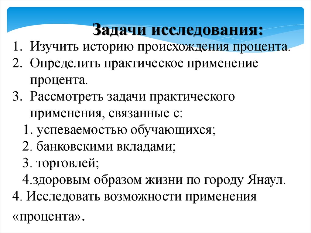 Задачи исследования:1. Изучить историю происхождения процента.