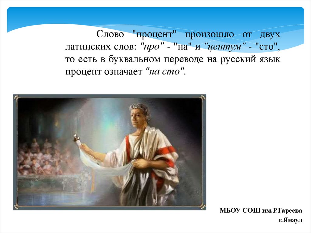Слово "процент" произошло от двухлатинских слов: "про" - "на" и "центум" - "сто",