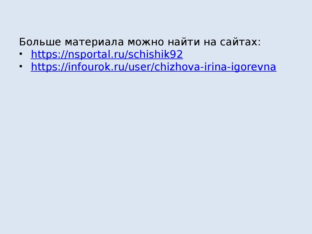 Больше материала можно найти на сайтах:• https://nsportal.ru/schishik92