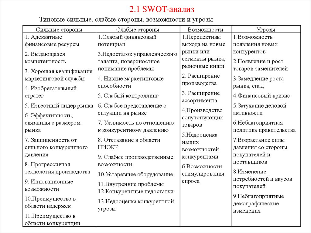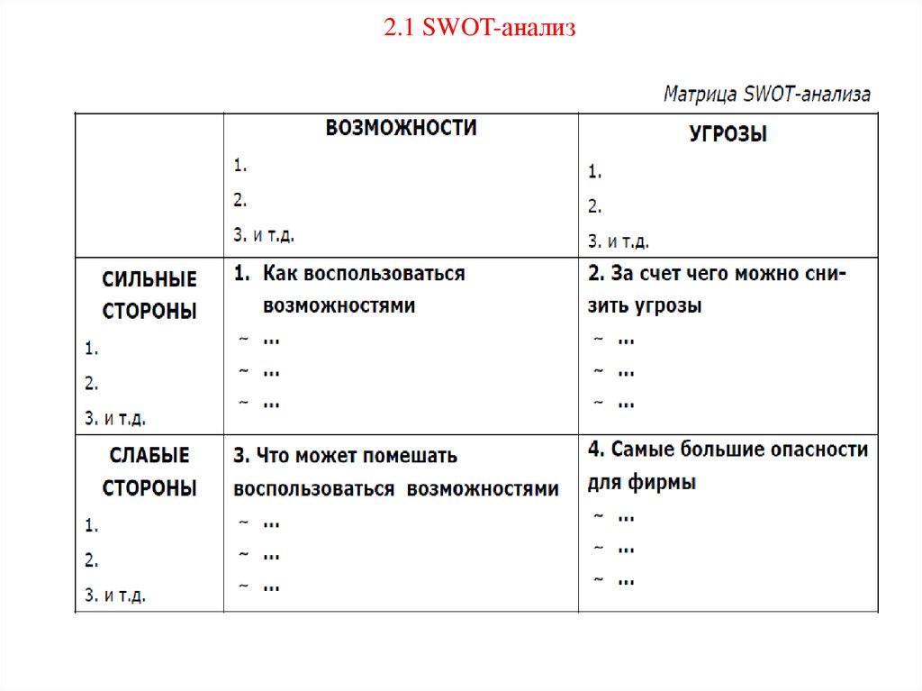В этом случае итогом анализа выступают не сильные и слабые стороны