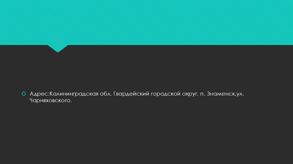 Адрес:Калининградская обл. Гвардейский городской округ. п. Знаменск,ул.Чарняховского.