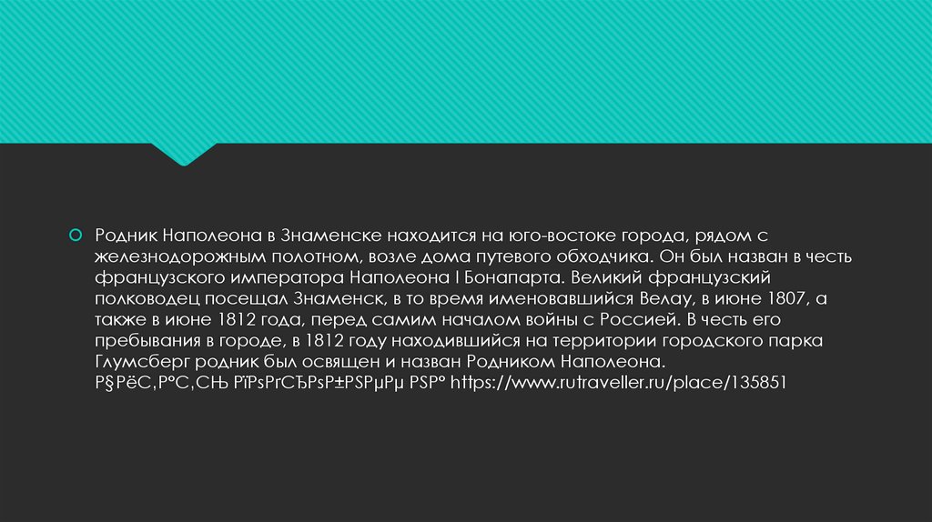 Родник Наполеона в Знаменске находится на юго-востоке города, рядом сжелезнодорожным полотном, возле дома путевого обходчика. Он был назван в честь