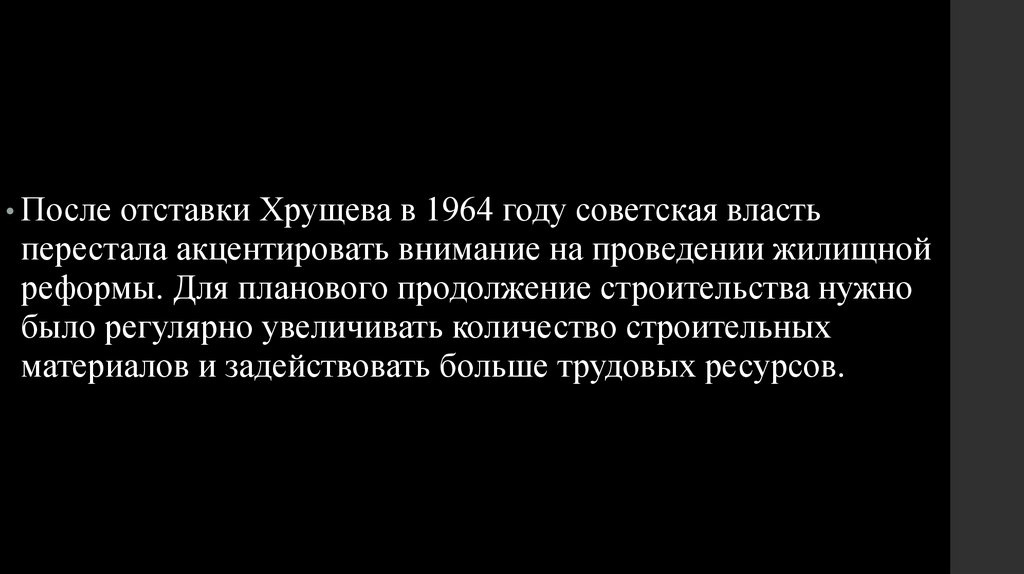 • После отставки Хрущева в 1964 году советская властьперестала акцентировать внимание на проведении жилищной