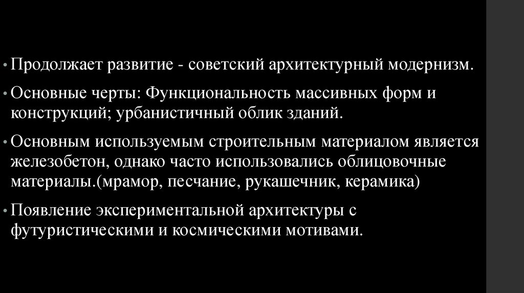 • Продолжает развитие - советский архитектурный модернизм.• Основные черты: Функциональность массивных форм и