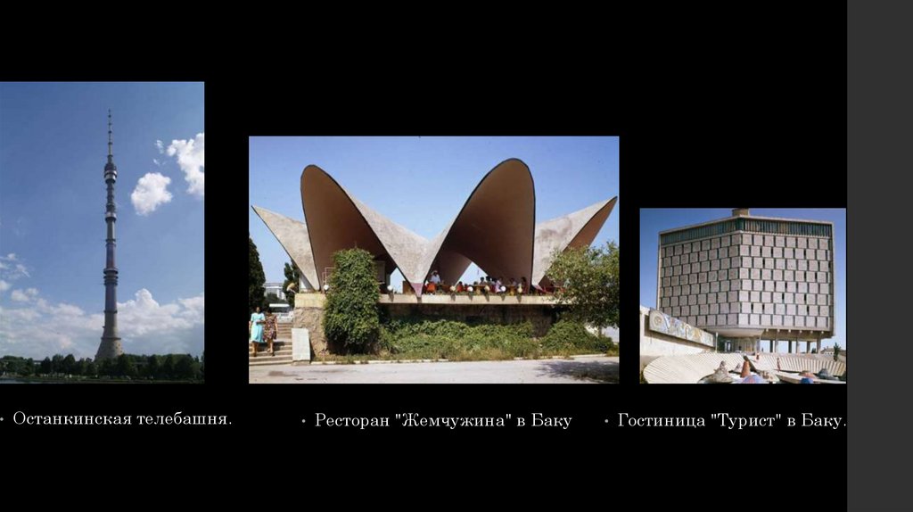 • Останкинская телебашня.• Ресторан "Жемчужина" в Баку