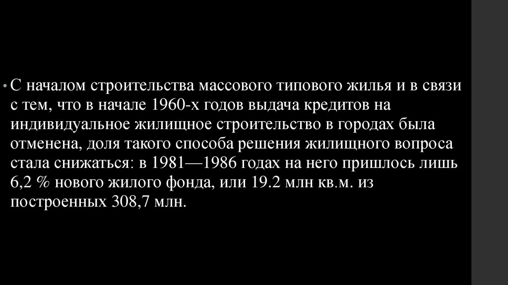 • С началом строительства массового типового жилья и в связис тем, что в начале 1960-х годов выдача кредитов на