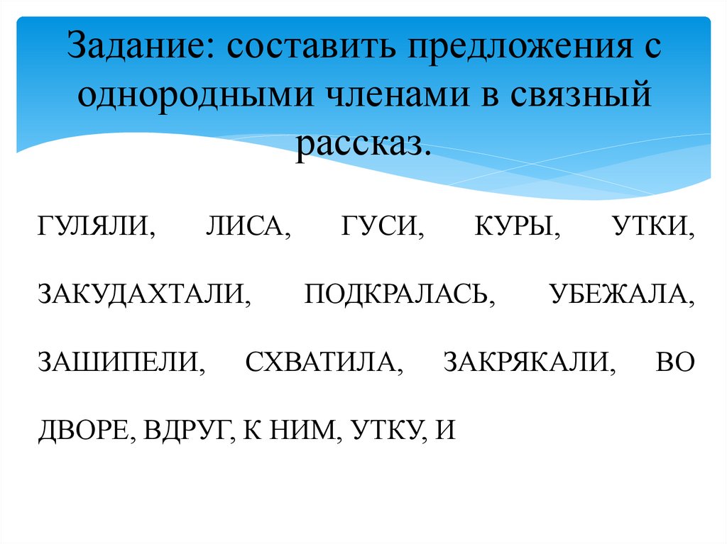Задание: составить предложения соднородными членами в связный