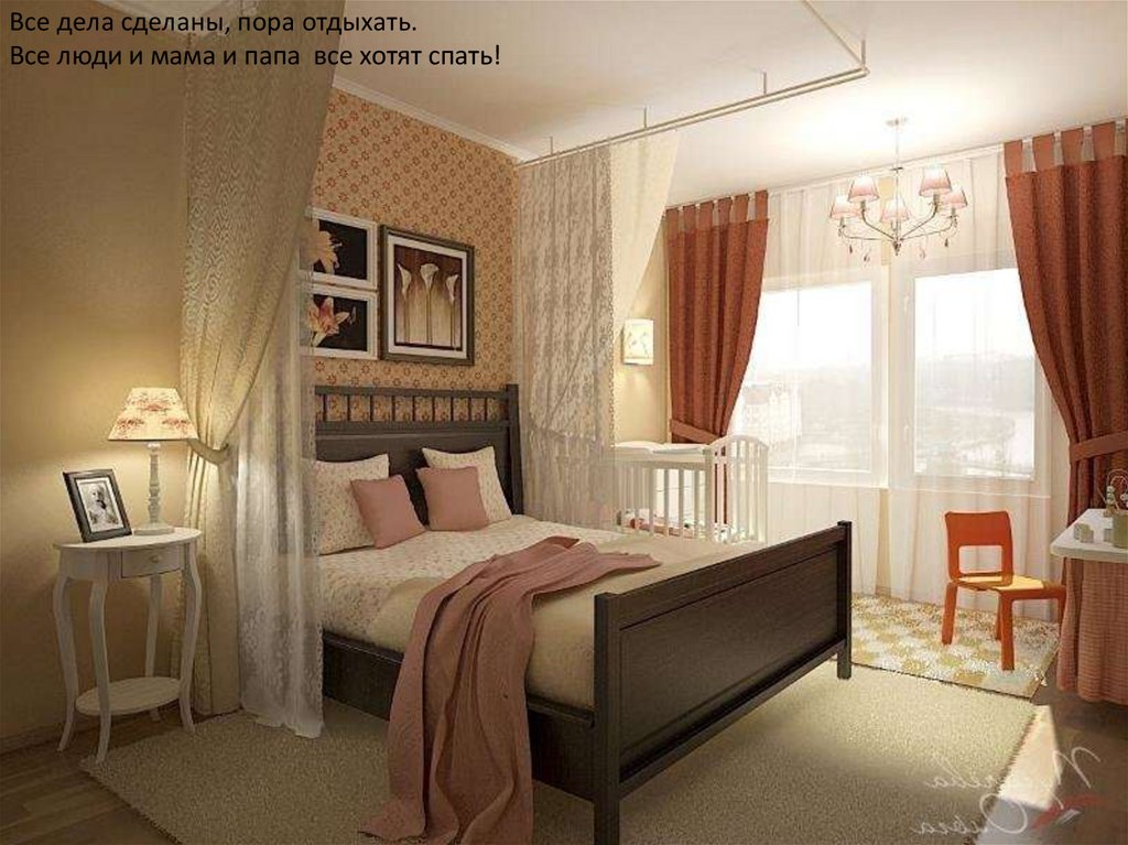 Все дела сделаны, пора отдыхать.Все люди и мама и папа все хотят спать!