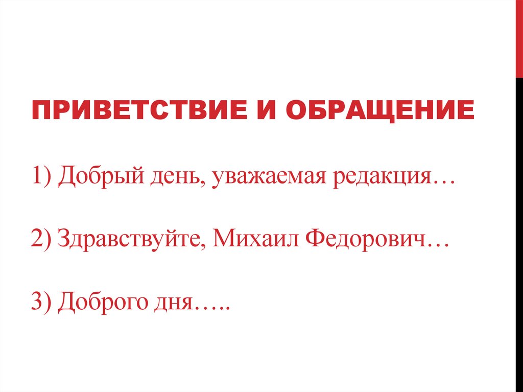 ПРИВЕТСТВИЕ И ОБРАЩЕНИЕ1) Добрый день, уважаемая редакция…