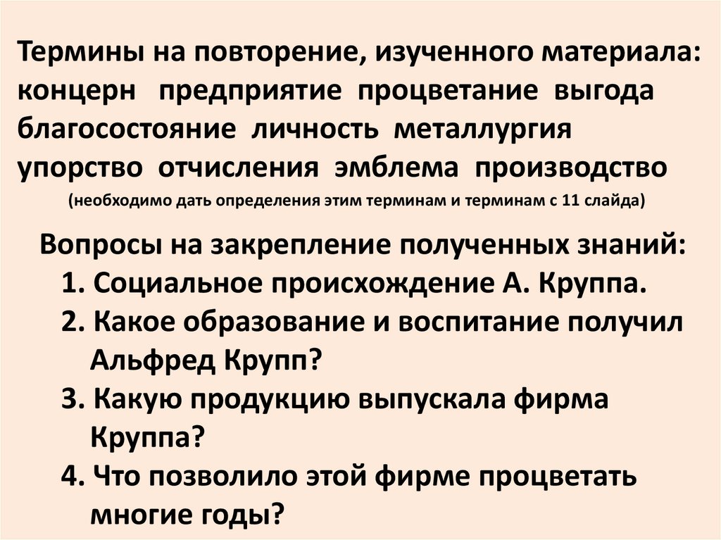 Термины на повторение, изученного материала:концерн предприятие процветание выгода