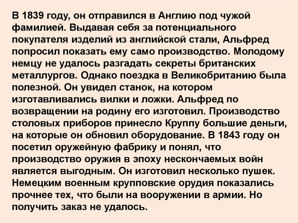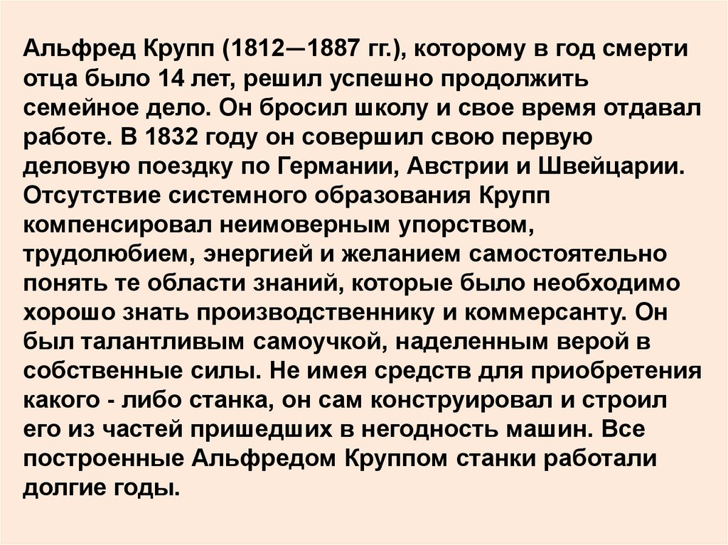 Альфред Крупп (1812—1887 гг.), которому в год смертиотца было 14 лет, решил успешно продолжить
