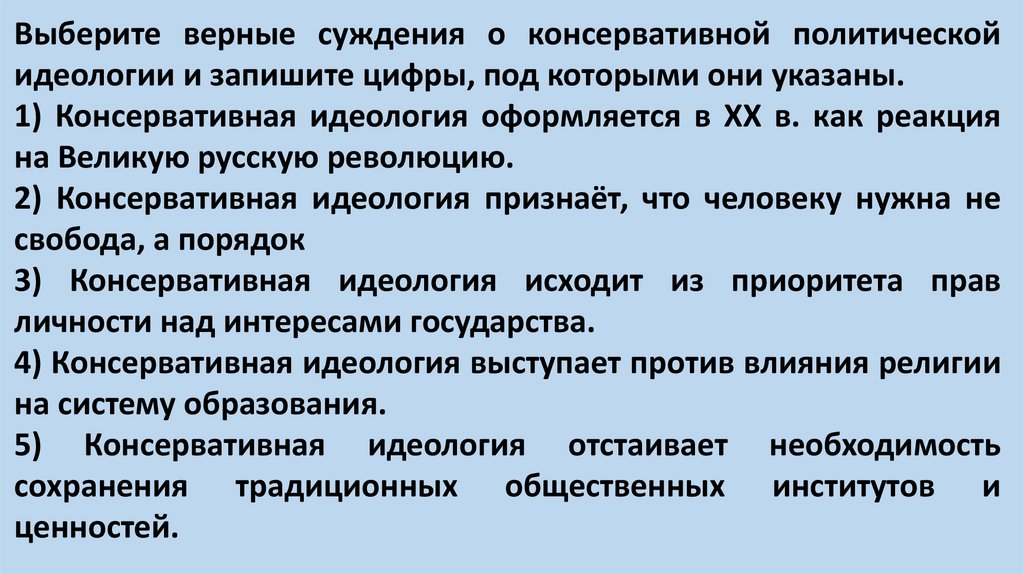 Выберите верные суждения о консервативной политическойидеологии и запишите цифры, под которыми они указаны.