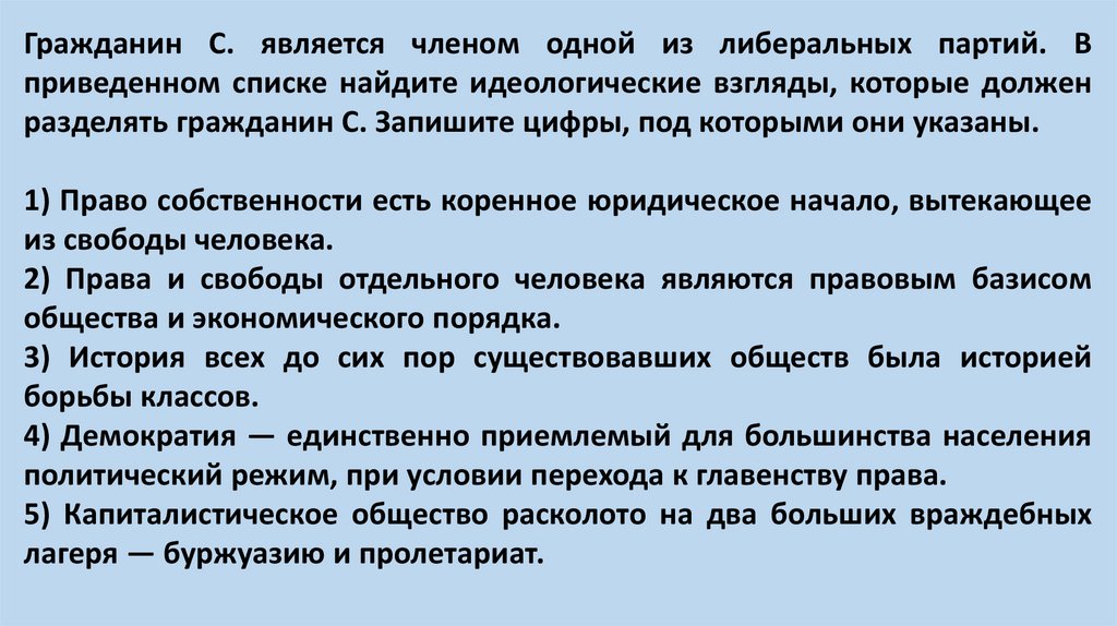 Гражданин С. является членом одной из либеральных партий. Вприведенном списке найдите идеологические взгляды, которые должен