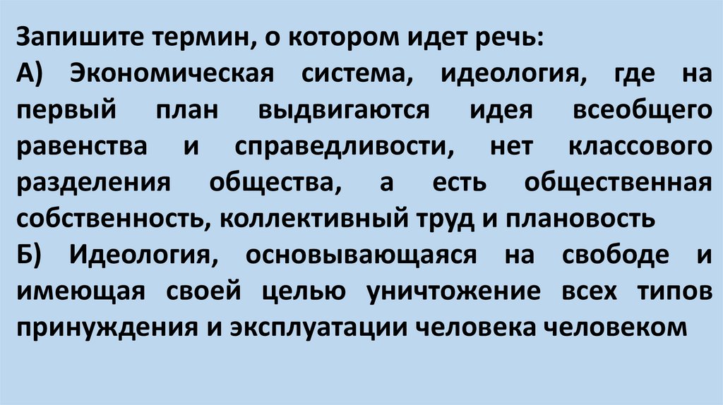 Запишите термин, о котором идет речь:А) Экономическая система, идеология, где на