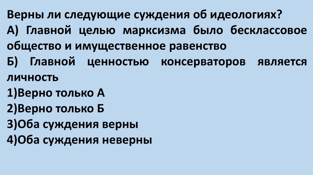 Верны ли следующие суждения об идеологиях?А) Главной целью марксизма было бесклассовое