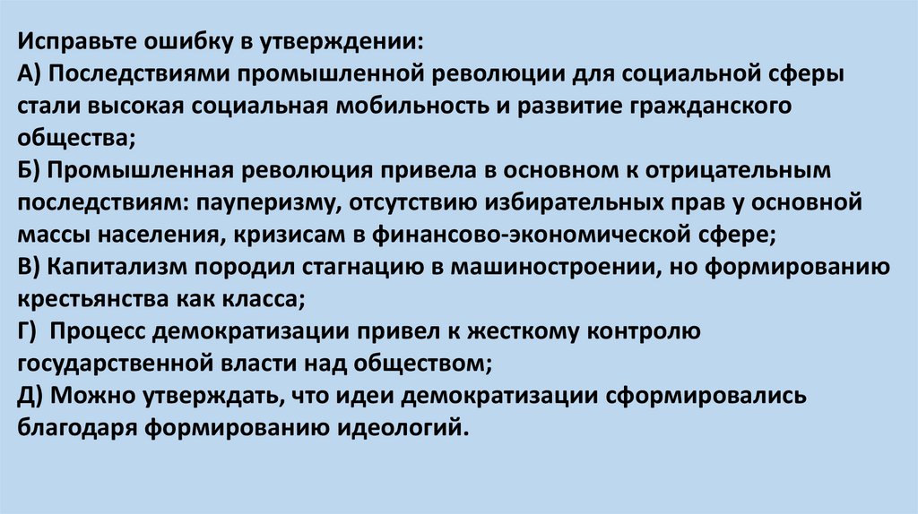 Исправьте ошибку в утверждении:А) Последствиями промышленной революции для социальной сферы