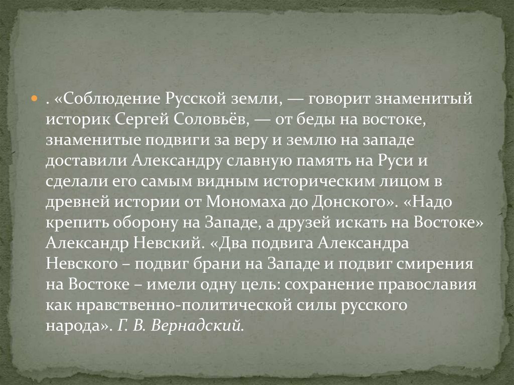 . «Соблюдение Русской земли, — говорит знаменитыйисторик Сергей Соловьёв, — от беды на востоке,