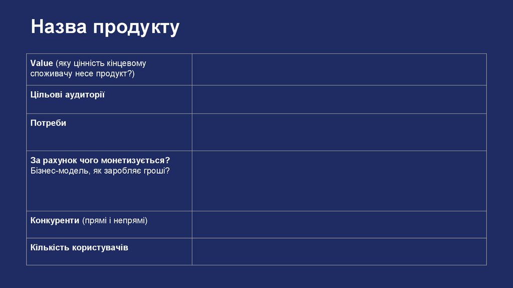 Назва продуктуValue (яку цінність кінцевому
