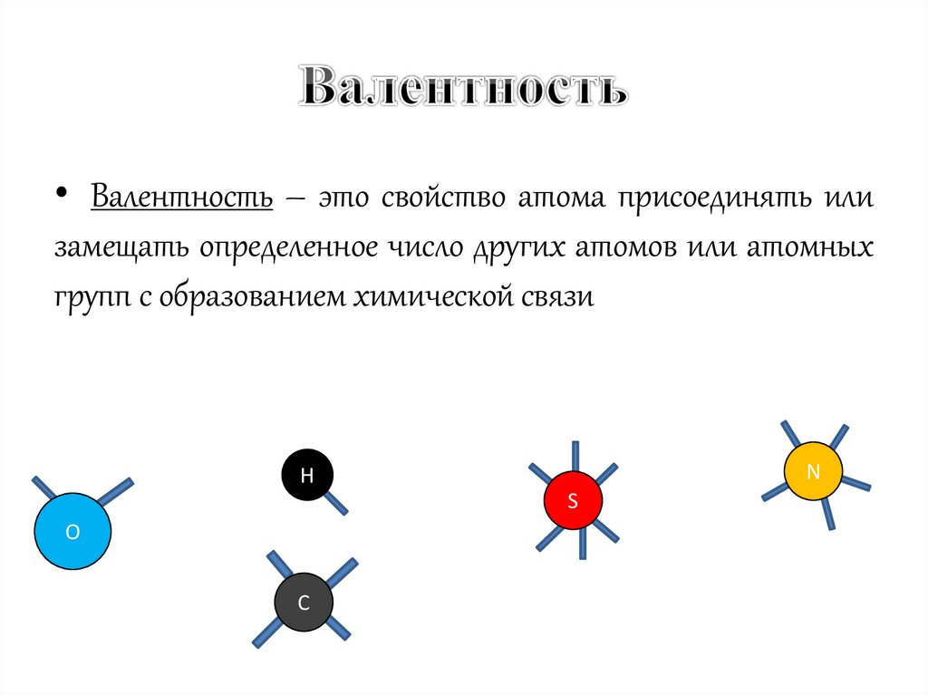 • Валентность – это свойство атома присоединять илизамещать определенное число других атомов или атомных