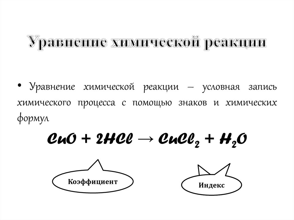 • Уравнение химической реакции – условная записьхимического процесса с помощью знаков и химических