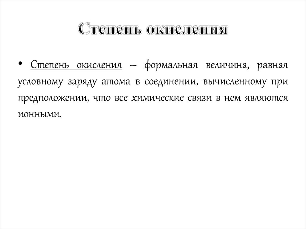 • Степень окисления – формальная величина, равнаяусловному заряду атома в соединении, вычисленному при