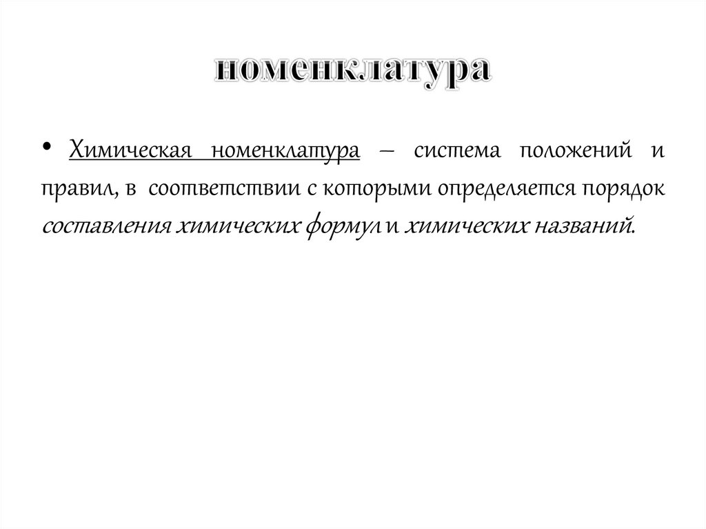 • Химическая номенклатура – система положений иправил, в соответствии с которыми определяется порядок