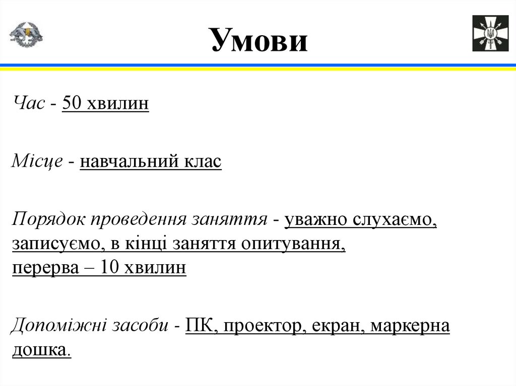 Допоміжні засоби - ПК, проектор, екран, маркерна
