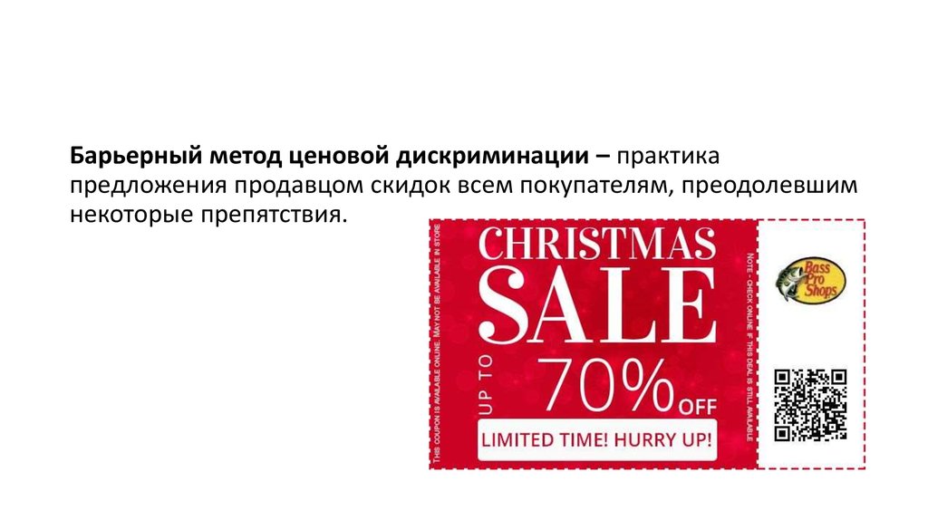 Барьерный метод ценовой дискриминации – практикапредложения продавцом скидок всем покупателям, преодолевшим