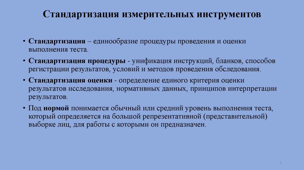Стандартизация измерительных инструментов• Стандартизация – единообразие процедуры проведения и оценки