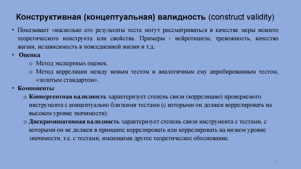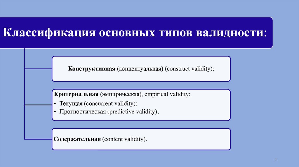 Классификация основных типов валидности:Конструктивная (концептуальная) (construct validity);