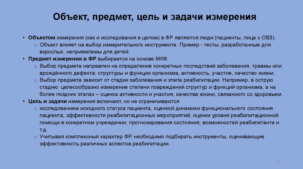 Объект, предмет, цель и задачи измерения• Объектом измерения (как и исследования в целом) в ФР являются люди (пациенты, лица с ОВЗ).
