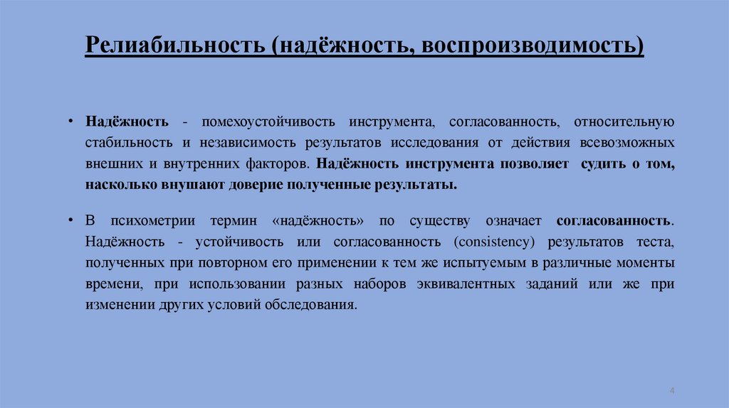 • В психометрии термин «надёжность» по существу означает согласованность.