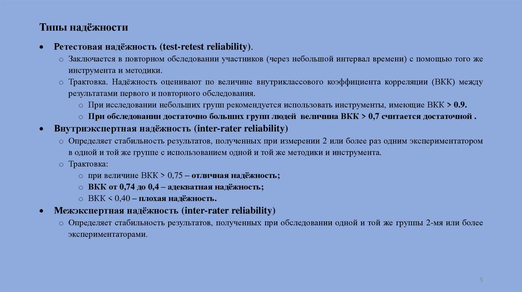 o Трактовка. Надёжность оценивают по величине внутриклассового коэффициента корреляции (ВКК) между