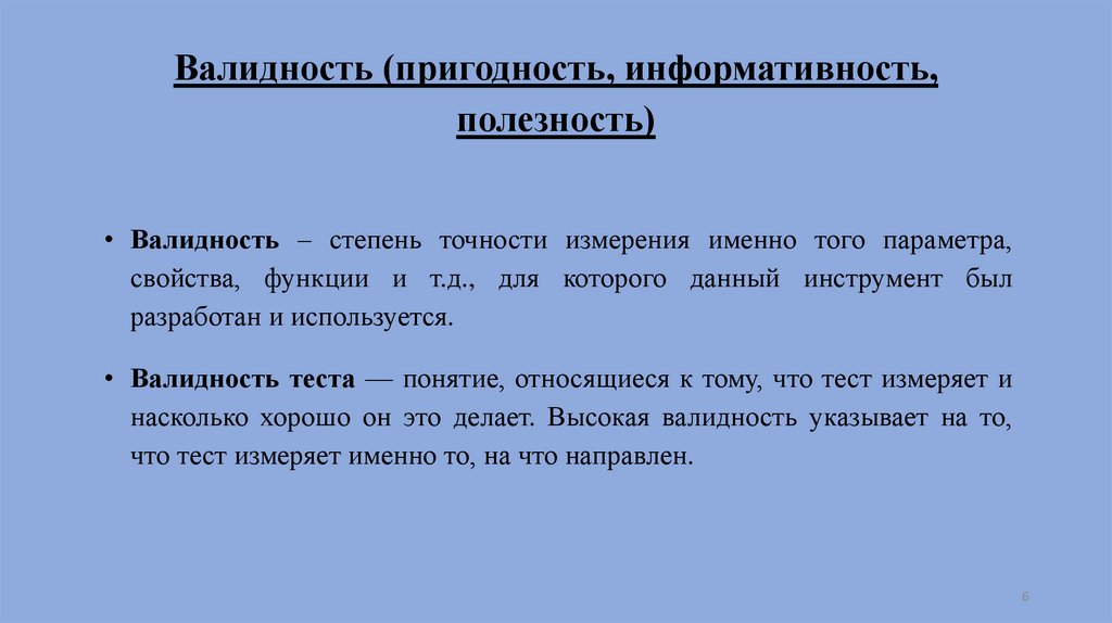 • Валидность теста — понятие, относящиеся к тому, что тест измеряет и