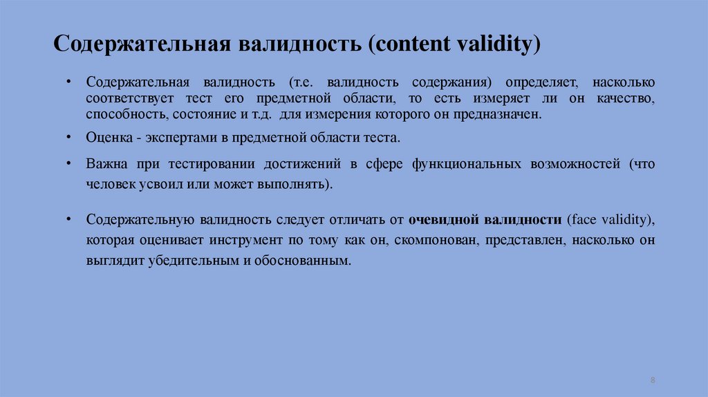 Содержательная валидность (content validity)• Содержательная валидность (т.е. валидность содержания) определяет, насколько