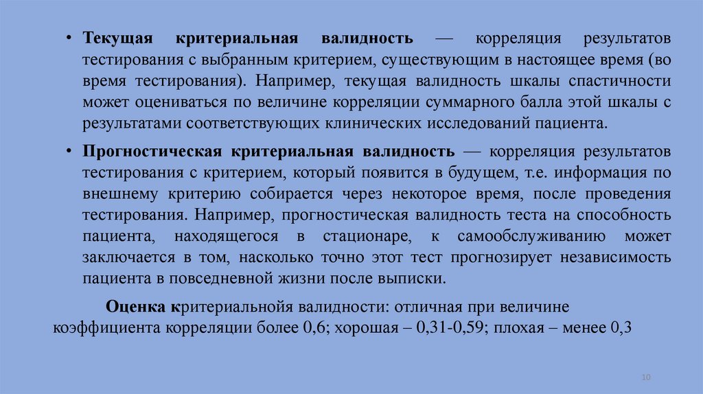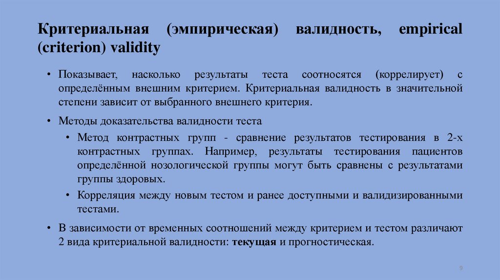 • Корреляция между новым тестом и ранее доступными и валидизированными