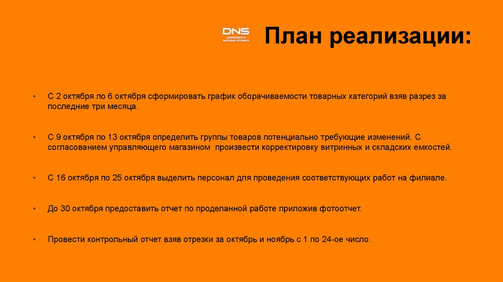 План реализации:С 2 октября по 6 октября сформировать график оборачиваемости товарных категорий взяв разрез за
