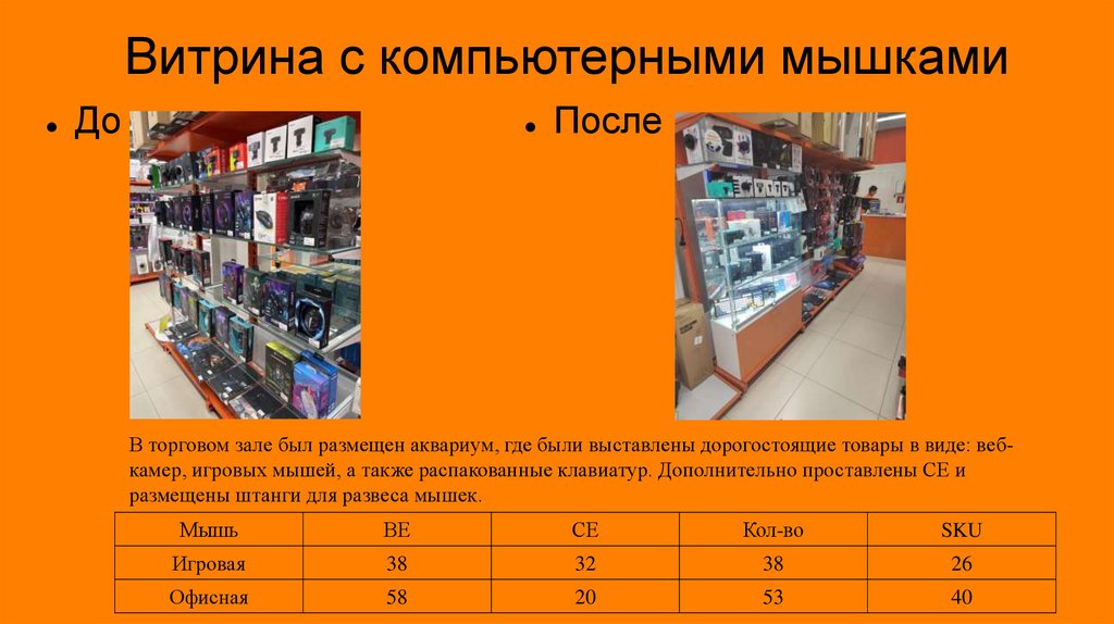 В торговом зале был размещен аквариум, где были выставлены дорогостоящие товары в виде: вебкамер, игровых мышей, а также распакованные клавиатур. Дополнительно проставлены СЕ и
