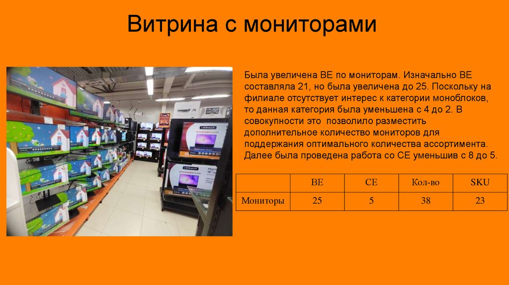 Витрина с мониторамиБыла увеличена ВЕ по мониторам. Изначально ВЕ