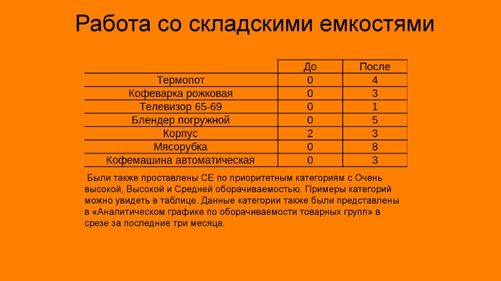 Работа со складскими емкостямиБыли также проставлены СЕ по приоритетным категориям с Очень
