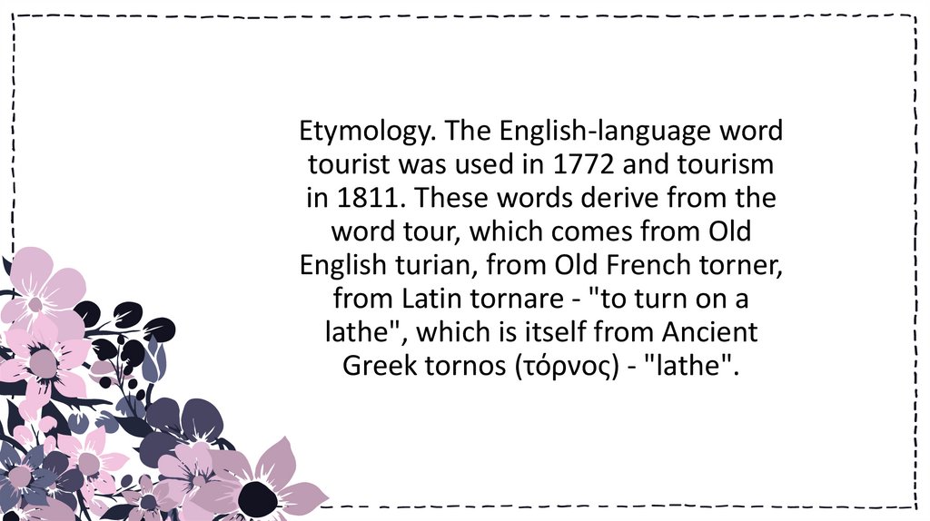 Etymology. The English-language wordtourist was used in 1772 and tourism