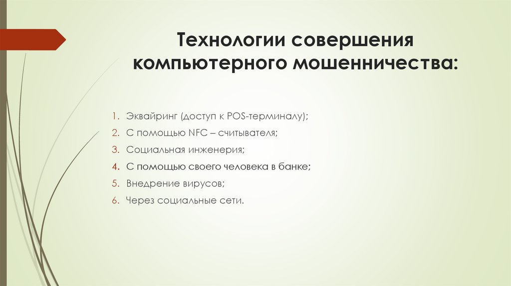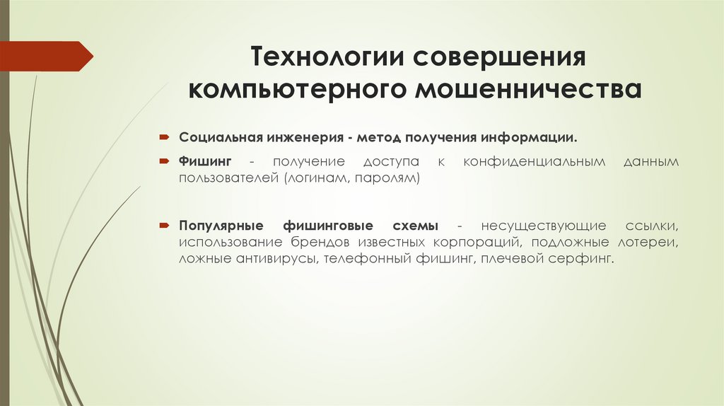 ложные антивирусы, телефонный фишинг, плечевой серфинг.