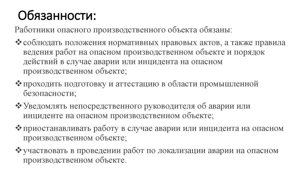 Обязанности:Работники опасного производственного объекта обязаны: