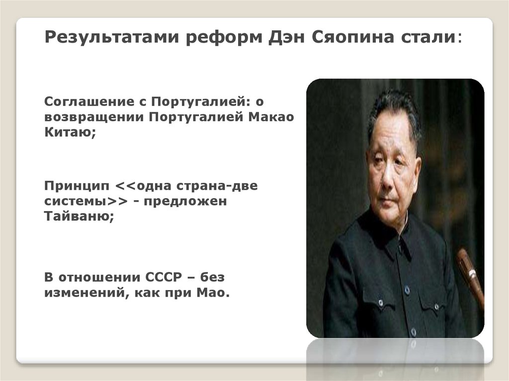 Результатами реформ Дэн Сяопина стали:Соглашение с Португалией: о