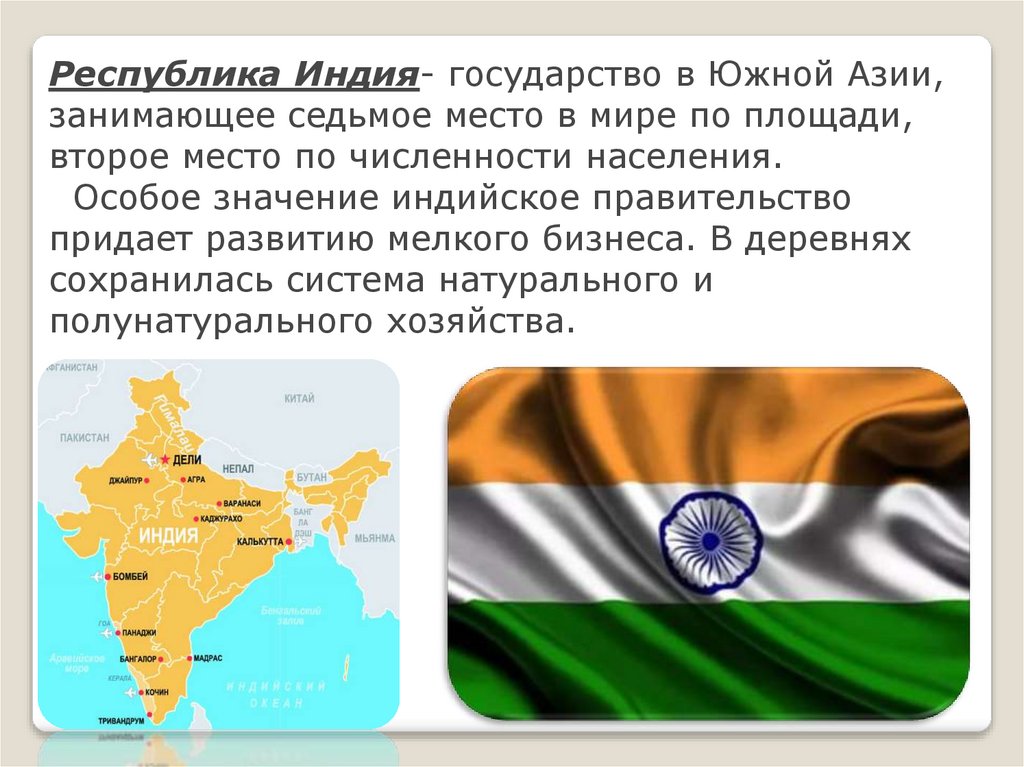 Республика Индия- государство в Южной Азии,занимающее седьмое место в мире по площади,