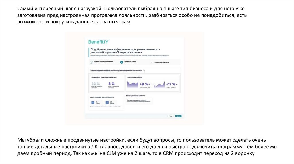 Самый интересный шаг с нагрузкой. Пользователь выбрал на 1 шаге тип бизнеса и для него ужезаготовлена пред настроенная программа лояльности, разбираться особо не понадобиться, есть